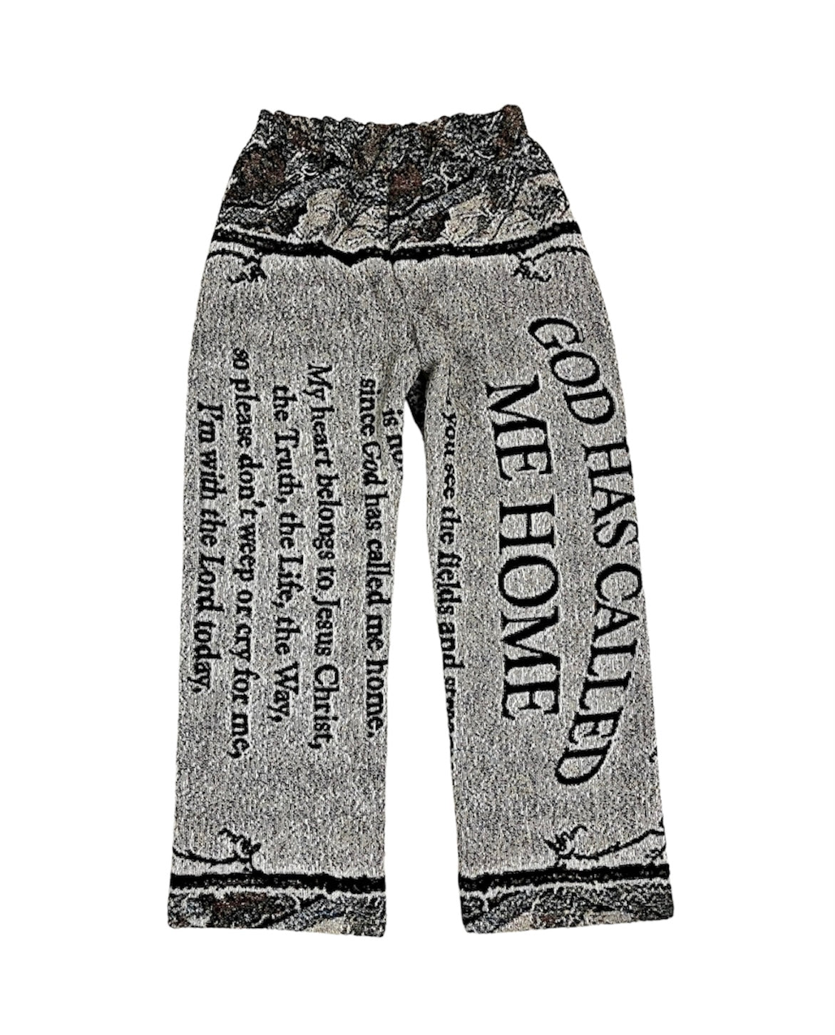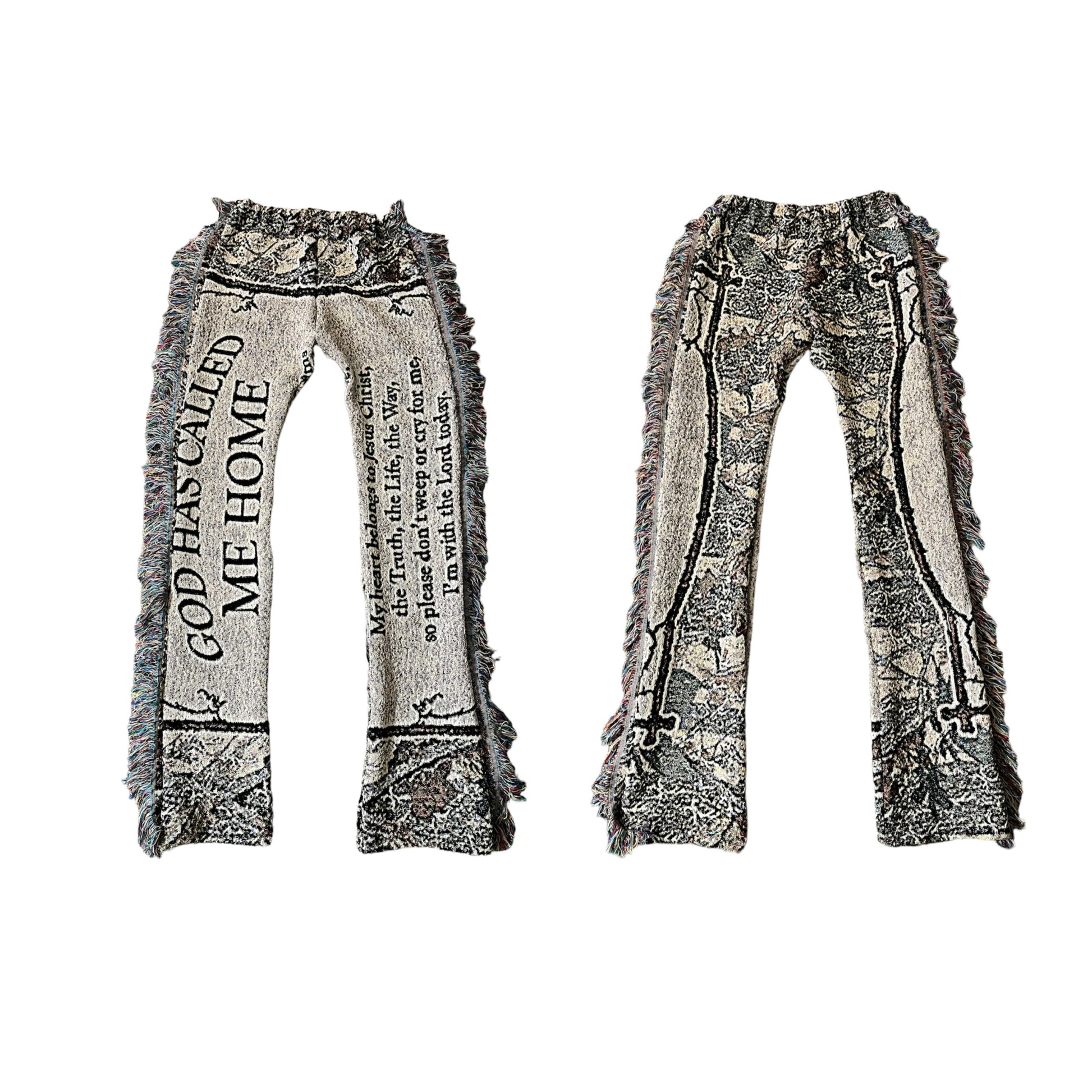The Tapestry Pants are designed with Woven Tapestry Throw Blankets with a straight-leg fit. Two pockets will be available if ordered without fringes.