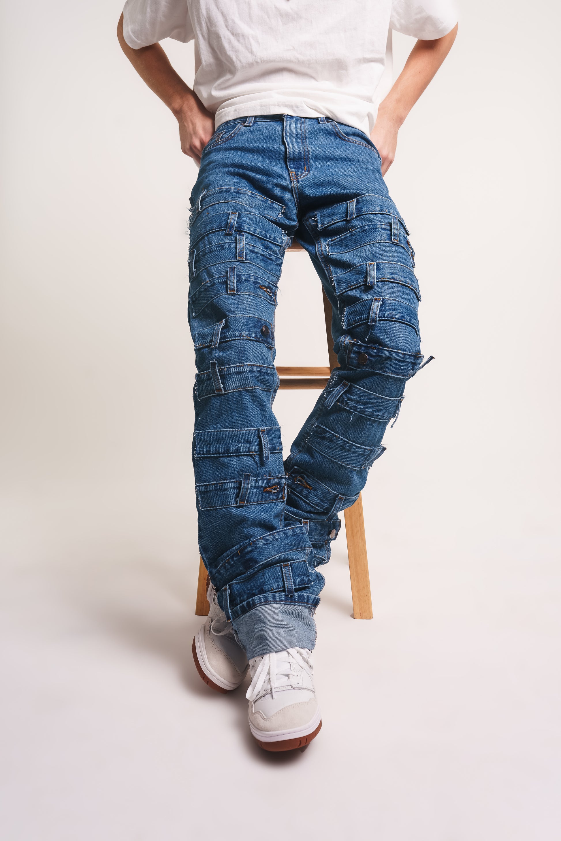 The Waistband Denim has a total of 4 pockets, 2 on the left side of the back butt pocket and 2 on the right side and all pockets are functional. This is made for your exact waist size. The back can also be worn on the front side as pictured.